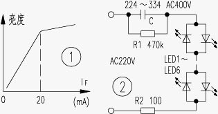 LED灯除了直流供电外,也可采用交流电网供电。LED的正向压降VF≤2.5V。采用变压器供电体积大,能耗较多,其优点是使用安全。应用容抗Xc为LED灯作镇流的交流电网供电,体积小,能耗省,但缺乏与电网的隔离,使用中须注意安全。最简电路如图2所示。
