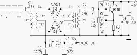 要想让收音机解调出单边带信号,必须产生一个假载波加到收音机上。笔者用收音机在实际收听单边带信号过程中,制作了如附图所示的单边带解调器,成功地解调出了单边带信号。图中电路由两部分组成:(1)由D1~D4、L1~L4组成环形解调器;(2)由V1与外围元件构成中频振荡器(充当载波);(3)由L5、C2、C3组成低通滤波器,单边带信号从收音机的信号检波之前取出。经屏蔽线通过C1、L1、L2送到D1~D4,同时中频振荡器产生的信号经L4、L3也送到D1~D4,此时两路信号在D1~D4中进行混频,产生和频与差频。其中差频是所要听的声频信号,它通过低通滤波器送到低放进行放大。