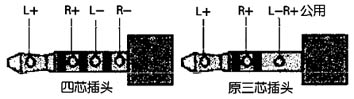 夏普在最新款的MD播放机MD-DS8上,新开发使用了4芯立体声耳机插头,见下图。原来大部分耳机都使用3芯插头,使其立体声的R信号与L信号共用一条地线。由于信号电流通过了共同使用的地线,会出现R信号和L信号中,某一方的电流波形使另一方的信号失真的问题。采用4芯耳机线将R信号与L信号的地线分别独立走线,避免了相互干扰,音质更好。