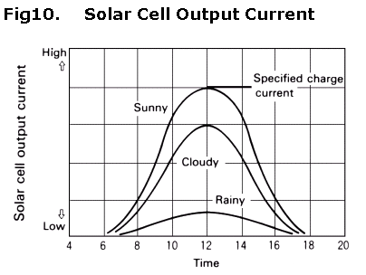 太阳能电池的输出电流受天气条件的影响。图10说明了太阳能电池的输出电流与每天不同时间的关系。当天气为阴天时,充电不充分。但是太阳能电池在设计时需考虑在晴天时最大输出电流不会超过指定的电流。