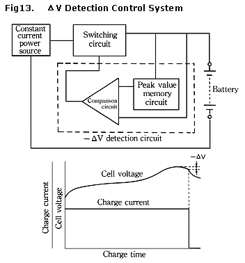 这种方式采用了电压检测系统。不过,当峰值确定后,环境温度补偿电路可不必考虑在内。当电压降达到预定值后,充电电流被切断。