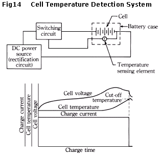 在充电末期,负极发生氧复合反应产生热量,使电池温度升高。为控制充电电流,可在电池钢壳外部放置温度感应器或热电偶检测电池温度。此时,电池已处在过充状态,这就要求电池有一定的耐过充能力。图14是简图。此电路简单且成本低廉。