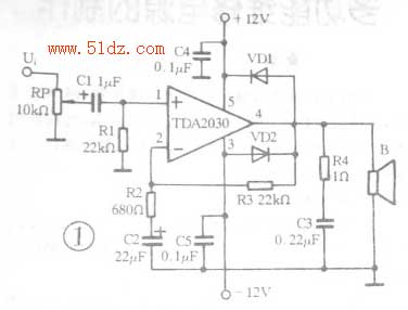 RP是音量调节电位器,C1是输入耦合电容,R1是TDA2030同相输入端偏置电阻。