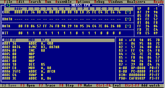 在执行过程中注意观察屏幕左边的工作寄存器及A累加器中的值的变化。